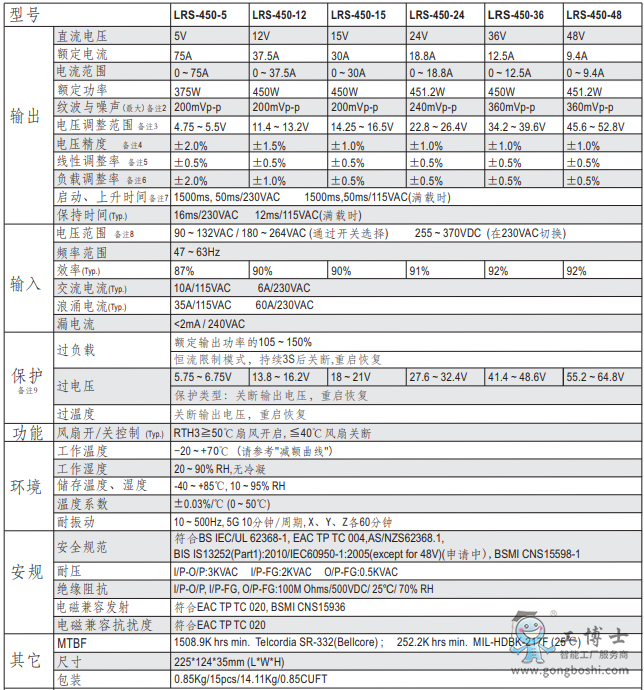 LRS-450系列是一款450W單組輸出封閉型電源供應(yīng)器,具有35mm低外型設(shè)計(jì),采用115VAC或230VAC輸入(通過開關(guān)選擇),整系列提供5V, 12V, 15V, 24V, 36V和48V除了效率高達(dá)92%,內(nèi)裝長壽命風(fēng)扇使LRS-450能滿負(fù)載工作于-20℃到+70℃的溫度范圍內(nèi)。LRS-450有完整的保護(hù)功能和抗5G振動能力;它符合完整的國際安全法規(guī),LRS-450為各種工業(yè)應(yīng)用提供了一個高性價比的解決方案。