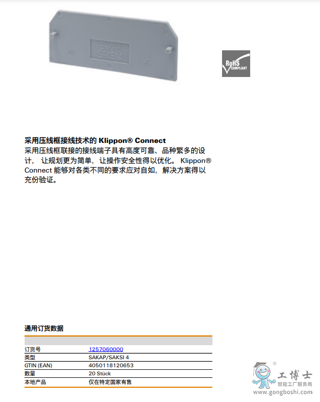 Weidmuller SAKAP/SAKS 4 魏德米勒 端子隔板 訂貨號1257060000 |