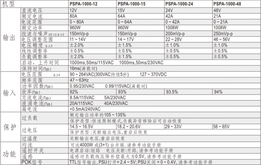明緯電源:1000W具有PFC和并聯功能 型號:PSPA-1000-12