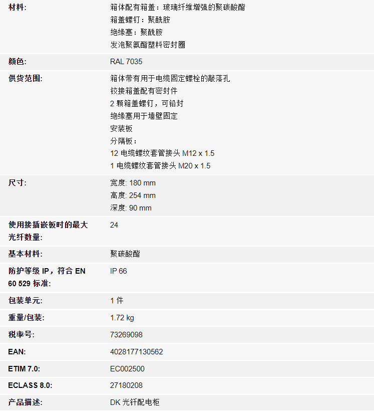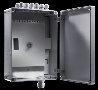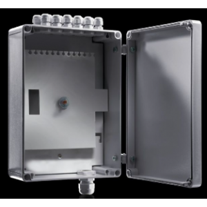 玻璃纖維加固的聚碳酸酯小型光纖分配器,具有安裝板和 PG 螺旋接頭。防護等級:IP 66。