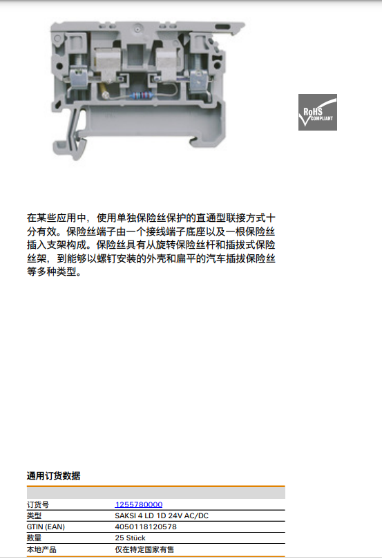 Weidmuller SAKSI 4 LD 1D 24V AC/DC 魏德米勒 熔斷器型接線端子 |