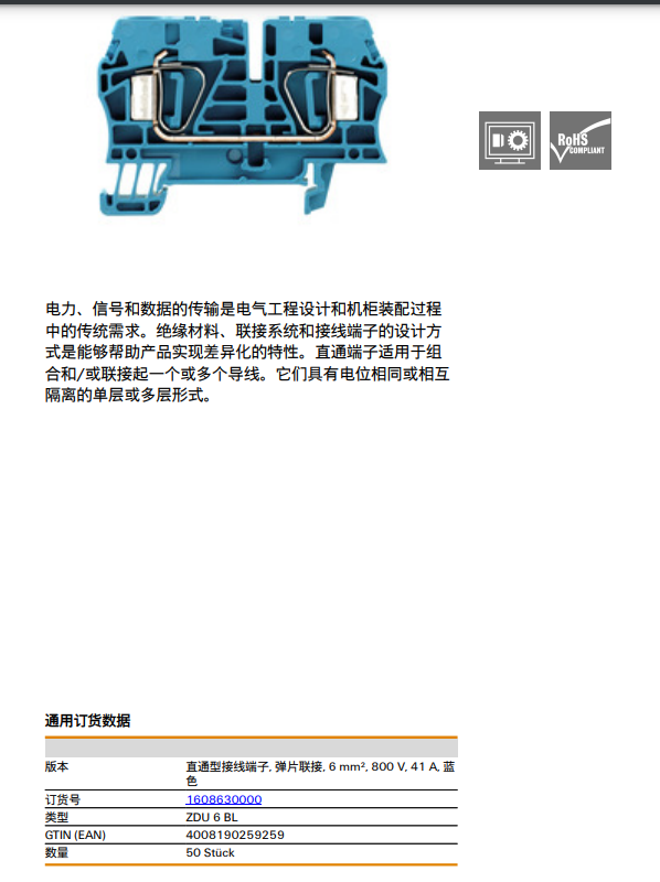 Weidmuller ZDU 6 BL 魏德米勒 直通型接線端子 訂貨號1608630000 |