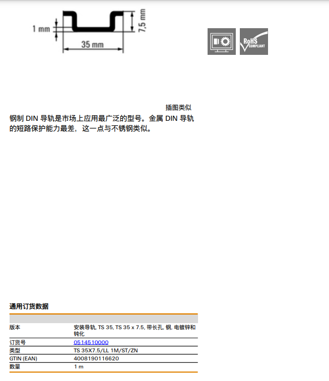 Weidmuller TS 35X7.5/LL 1M/ST/ZN 導軌 訂貨號0514510000 |