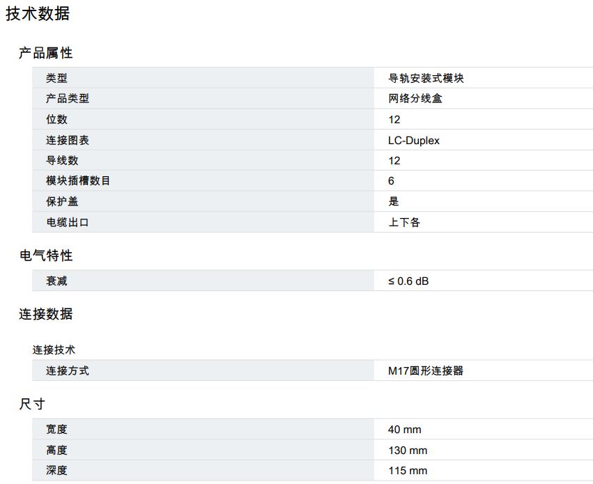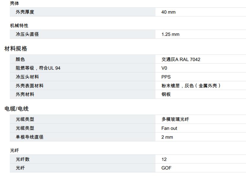 分配器,設計:DIN導軌模塊,保護類型:IP20,位數:12,材料:鋼板,連接方法:Q-ODC連 接器,電纜出線:下行,顏色:交通灰A RAL 7042,以太網