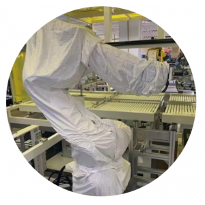 主要用于汽車制造、3C電子、拋光打磨和上下料等領域,主要起到防止涂料沾染機器人,防塵防靜電,防止灰塵等進入機器人本體造成線路老化或短路,同事有效傳導化解生產車間中涂料分子碰撞所產生的靜電,避免火災、爆燃等安全隱患。