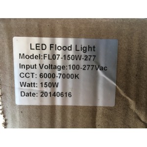 150W: LED Flood light, model FL07-150W-277, Input voltage: 100-277 Vac, CCT: 6000-7000k, Wallt:150W.