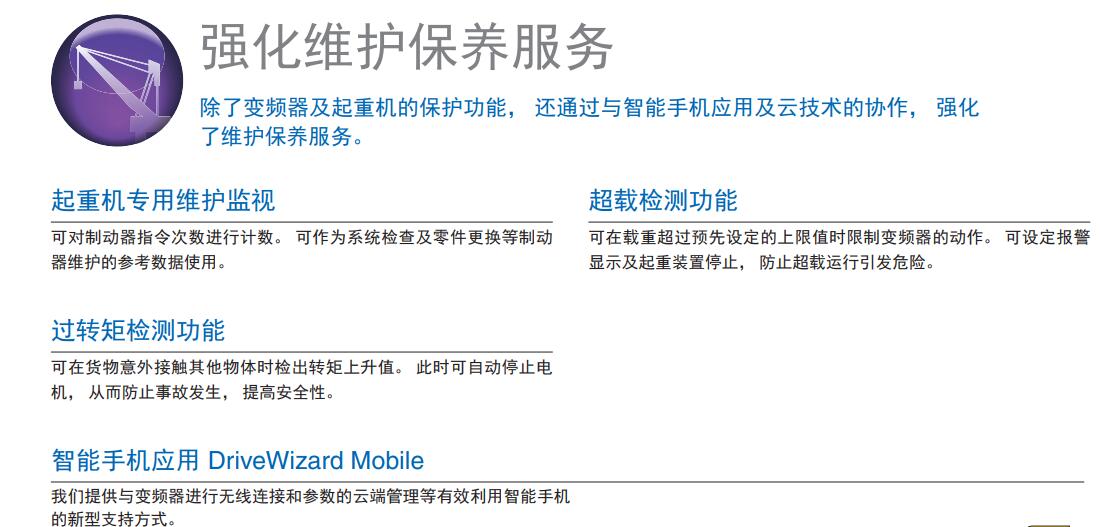 通過 “輕載增速功能”, 可實現與負載相匹配的***佳運行速度。 輕負載時***大可以6倍速度運行, 可縮短工程用起重機等揚程較長的 起重機的運行周期。 防撞功能 在搬運線等用途中, 在防撞指令有效的狀態下輸入停止指令時, 若 轉矩指令或輸出電流超過基準值,變頻器會判斷為臺車發生了碰撞, 并停止運行。 可進行簡易定位(防撞)。 行程限位功能 通過限位傳感器輸入可防止超程及過度卷揚。 運行指令調整功能 點動時切實動作。 此外, 還可以防止在下降動作剛結束后進行卷揚 動作時產生過大的電流。 (注)6倍速運行時, 需要馬達專用設計。