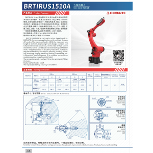 BRTIRUS1510A是伯朗特機器人股份有限公司針對多自由度的復雜應 用而開發的六軸機器人,其 負載可達10kg,擁有1500mm臂 展。采用輕坦式手臂設計,機械結構緊湊、簡潔,在高速運動狀態 下,能夠在狹小工作空間內進行靈活作業,滿足柔性化生產需要。六 個自由度的靈活性對上下料、注塑、壓鑄、裝配、涂膠、打磨、檢測 等場景能夠隨心所欲。