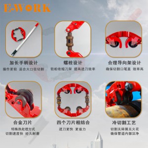 旋轉(zhuǎn)式切管機(jī)系列產(chǎn)品是E-WORK生產(chǎn)的一系列可切割大管徑碳鋼、不銹鋼、鑄鐵、球墨鑄鐵管的專業(yè)冷切割工具。超合理的機(jī)身設(shè)計(jì),巧妙的結(jié)構(gòu)設(shè)置,使切割管道更快、更省力!切割刀片由高強(qiáng)度工具鋼制成,經(jīng)過特殊熱處理方式,使刀片的強(qiáng)度和韌度達(dá)到平衡,既保證了刀片切割快速,又經(jīng)久耐磨。