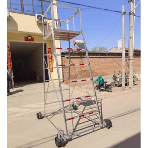梯車(車梯)選用高強度鋁合金材料制造,型材截面設計合理,重量輕,車梯底架用鋼管制造,保證底架的穩定性和安全性,不變形。車輪為稀土尼龍輪強度高、運轉無噪音、絕緣性能好,其中有一車輪鑲嵌鋼環,解決安全接地問題。