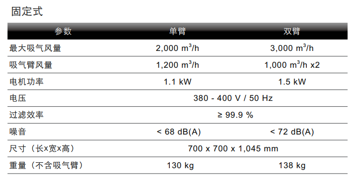 機械式凈化器按安裝方式有固定式和移動式兩種,可配置1-2根柔性或剛性吸氣臂,標準單臂長度2-8m可選。移動式凈化器設計結構緊湊,移動靈活,