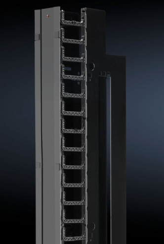 用于隱蔽鋪設(shè)電纜的電纜槽。可隨時便捷地通過鉸鏈連接的電纜槽蓋鋪設(shè)電纜,槽蓋可拆卸。可以從電纜槽內(nèi)部或背板將電纜穿引至箱體。隨附于理線槽的電纜固定桿可插入手指形理線架,從而輔助電纜導(dǎo)入。該電纜槽也可選擇采用螺栓進行連接。為優(yōu)化空氣導(dǎo)流,可與用于 TS IT 的毛刷套件組合使用。