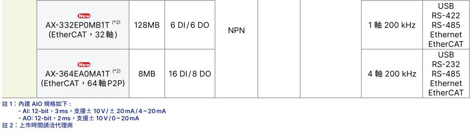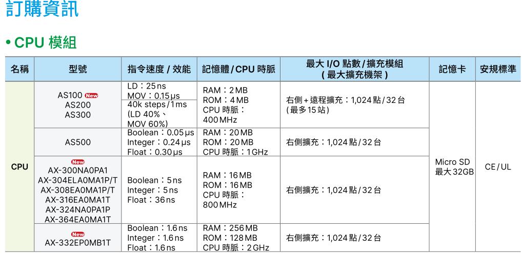 32- bit SoC CPU,大幅提昇效能 (40k steps / ms),***多可擴充32臺模組或***大1,024點I/O;