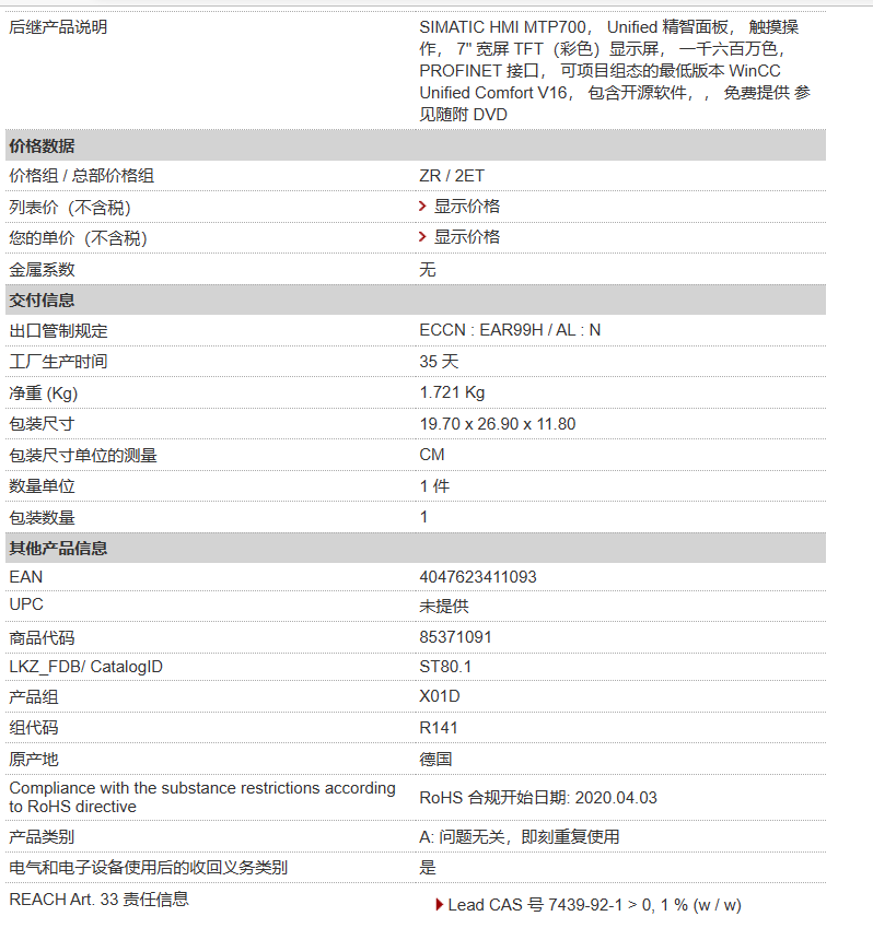 SIMATIC HMI MTP700, Unified 精智面板, 觸摸式操作, 7" 寬屏 TFT 顯示屏, 一千六百萬色, PROFINET 接口, 可項目組態的***低版本