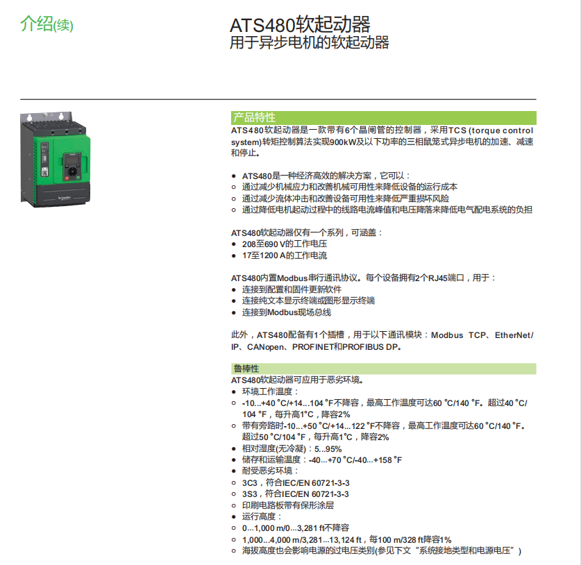 1. ATS480軟起動器***大起動電流可高達額定電機電流的7倍,可覆蓋208至690V的工作電壓,其TCS轉矩控制能夠減少機械磨損,確保平穩的啟停,能夠應對嚴苛的常載和重載應用場合;其印刷電路板覆蓋加強防護涂層,滿足3C3/3S3環境耐受等級標準,能夠提高產品的魯棒性,應對高粉塵、高污染等惡劣環境。