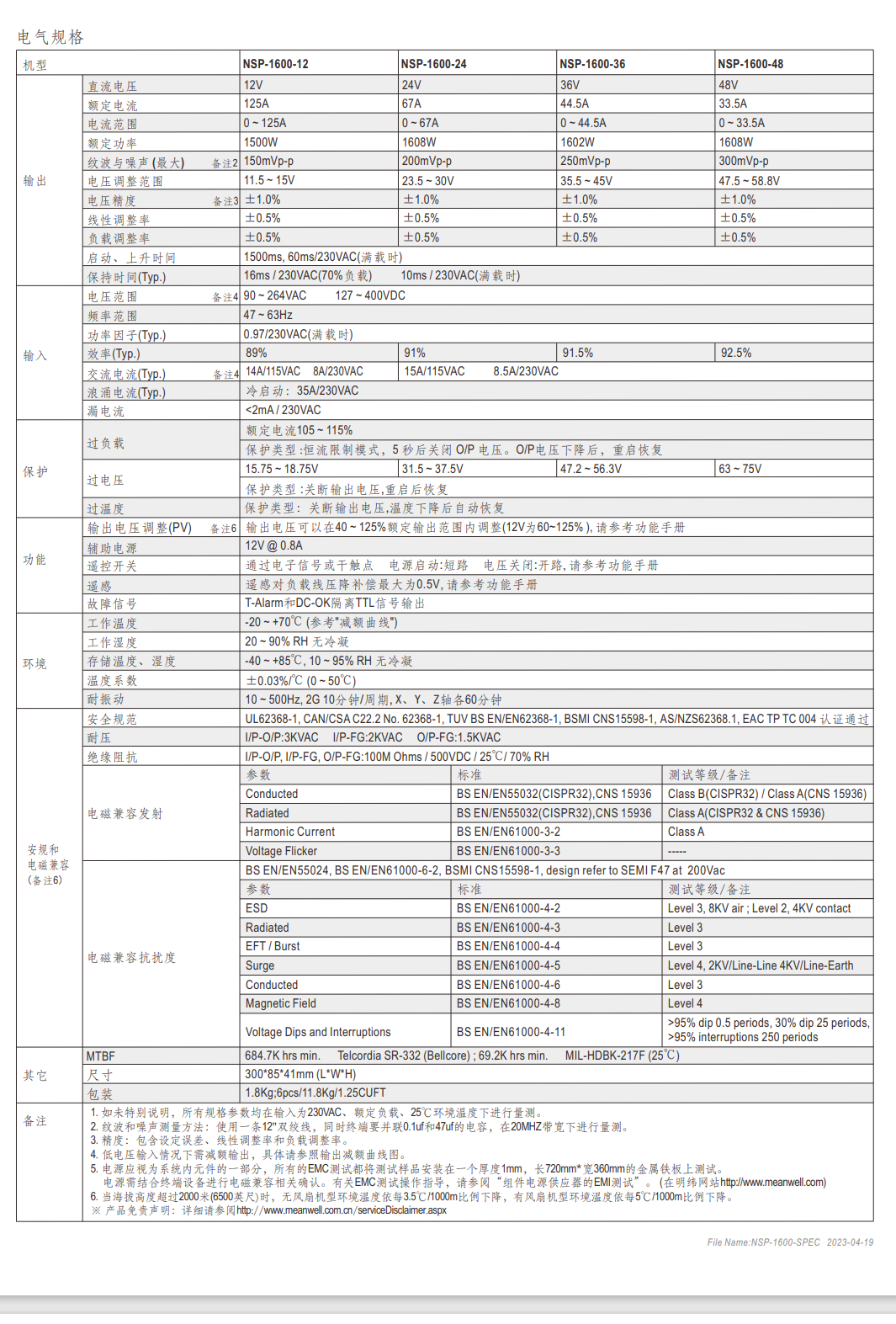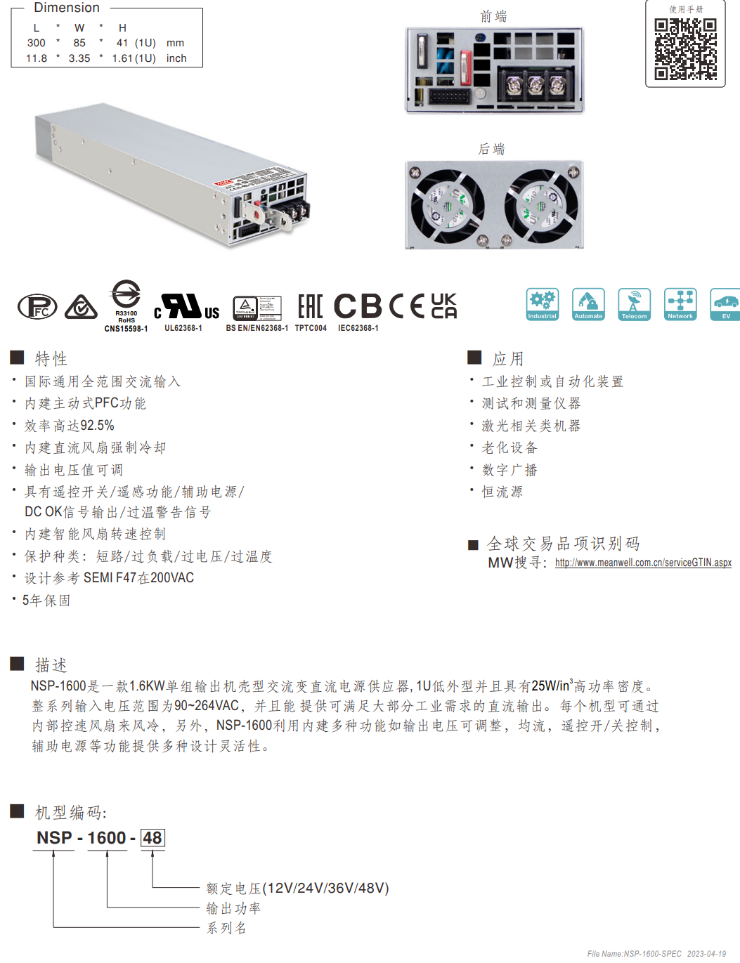NSP-1600是一款1.6KW單組輸出機殼型交流變直流電源供應器, 1U低外型并且具有25W/in 3高功率密度。 整系列輸入電壓范圍為90~264VAC, 并且能 提供可滿足大部分工業需求的直流輸出。每個機型可通過 內部控速風扇來風冷, 另外, NSP-1600利用內建多種功能如輸出電壓可調整,均流,遙控開/關控制, 輔助電源等功能提供多種設計靈活性。