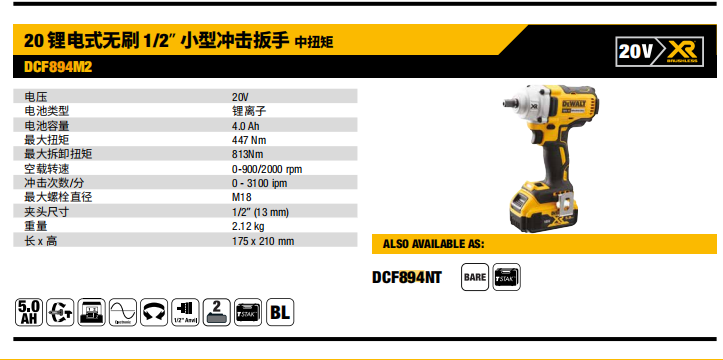 得偉DCF894M2無刷充電式20V沖擊扳手
