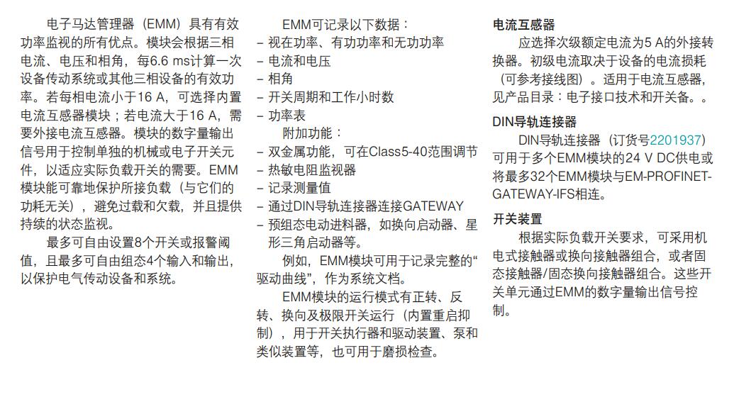 電子馬達管理器(EMM)電子馬達管理器模塊具有進行現代化有功功率監視的所有優點。馬達管理器適用于高性能應用,可測量和監視馬達運行狀態。EMM模塊提供高性能的參數監測功能,只是不提供負載驅動功能。