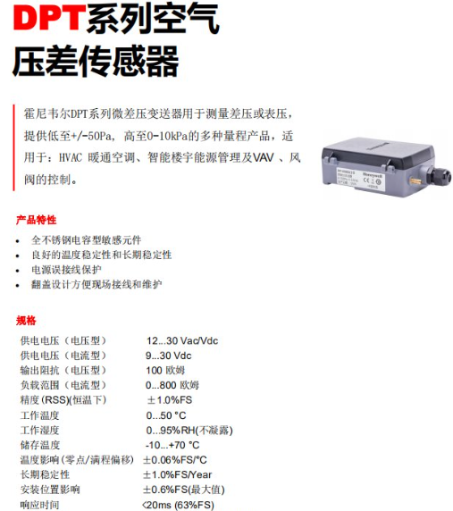 特點規格供電電壓(電壓型)12 30 Vac/Vdc 供電電壓(電流型)9 30 Vdc輸出阻抗(電壓型)100 歐姆負載范圍(電流型)0 800 歐姆精度(RSS)(恒溫下)±1.0%FS工作溫度0 50 ℃工作濕度0 95%RH(不凝露 ) 儲存溫度℃溫度影響(零點/滿程偏移 )±0.06%FS/℃長期穩定性±1.0%FS/Year安裝位置影響±0.6%FS(***大值)響應時間<20ms (63%FS)測量介質空氣或無腐蝕性不導電氣體外殼材質聚碳酸酯認證 ) 外殼防護等級IP65 重量約 220 克認證CE 霍尼韋爾DPT系列微差壓變送器用于測量差壓或表壓, 提供低至高至的多種量程產品,適用于:HVAC 暖通空調、智能樓宇能源管理及 VAV 、風閥的控制。