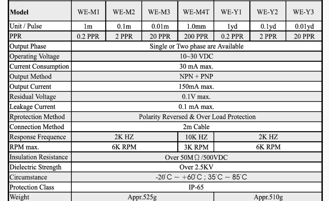 1、超高反應頻率:10K HZ。 2、免加油軸承,超高機構轉速:6K RPM。 3、**的電壓和電流NPN+PNP雙出力。 4、具有短路保護和極性反接保護回路。 5、**重心機構設計,體積小、安裝不占空間,重心穩(wěn),量測準。 WE-M1 WE-M1T WE-M2 WE-M2T WE-M3 WE-M3T WE-M4T WE-Y2 WE-Y2T WE-Y3 臺灣陽明編碼器
