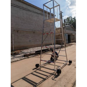 梯車(車梯)選用高強度鋁合金材料制造,型材截面設計合理,重量輕,車梯底架用鋼管制造,保證底架的穩定性和安全性,不變形。車輪為稀土尼龍輪強度高、運轉無噪音、絕緣性能好,其中有一車輪鑲嵌鋼環,解決安全接地問題。
