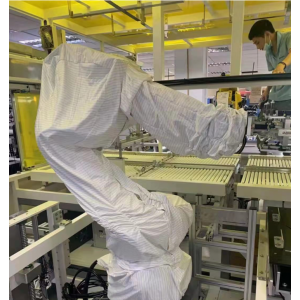 機器人抗靜電防護服主要用于汽車制造、電子加工、3C行業、拋光打磨和上下料等行業, 它主要起到防止涂料沾染機器人,防塵防靜電效果,防止灰塵進入機器人本體對機器人內部線路造成老化形成短路,同時也有效傳到化解生產車間中涂料分子碰撞 所產生的靜電,避免火災、爆燃等安全隱患。
