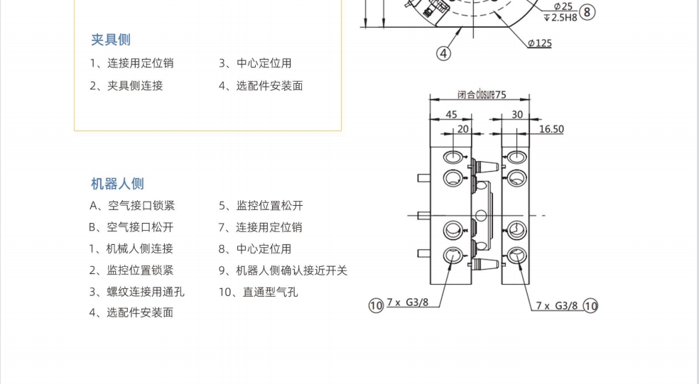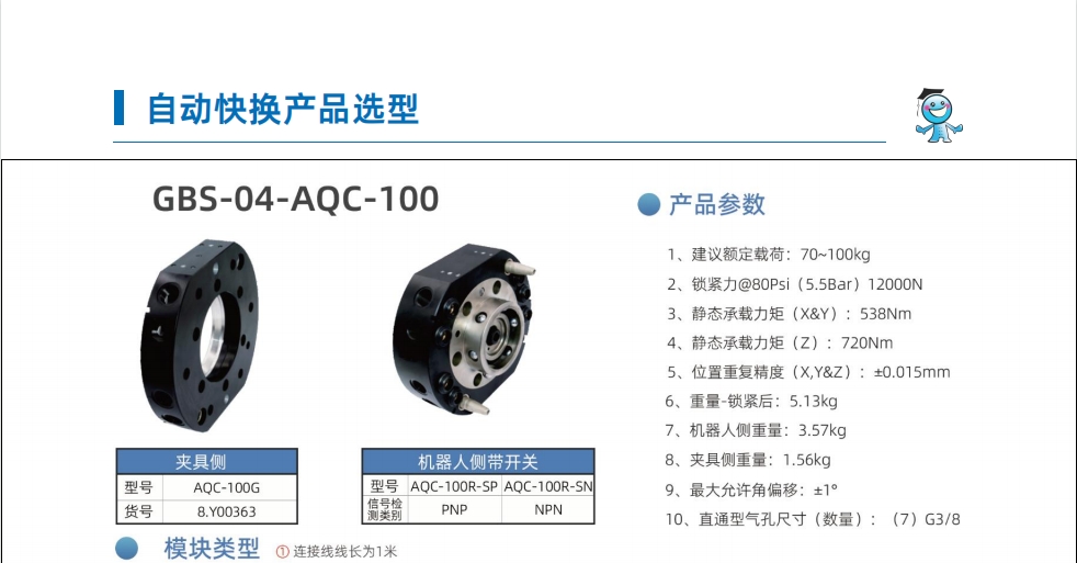 機器人末端快換裝置以高精度、高強度、高性能的產品優勢使單臺機器人能夠在制造和裝配過程中更換不同的末端執行器以增加柔性。