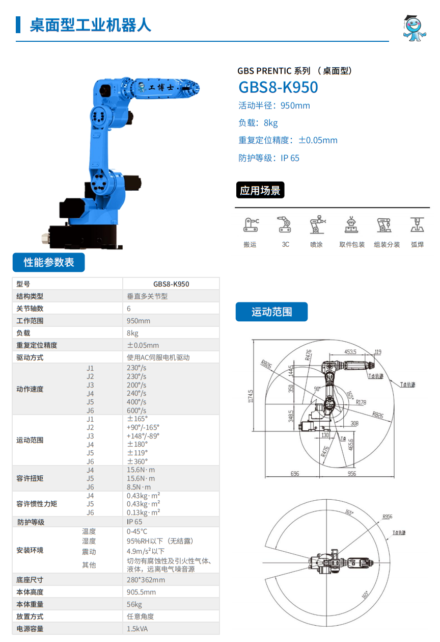 工博士機器人GBS8-K950 負載:8kg臂展:950mm |
