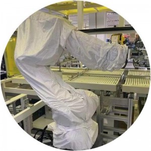 主要用于汽車制造、3C電子、拋光打磨和上下料等領域,主要起到防止涂料沾染機器人,防塵防靜電,防止灰塵等進入機器人本體造成線路老化或短路,同時有效傳導化解生產車間中涂料分子碰撞所產生的靜電,避免火災、爆燃等安全隱患。