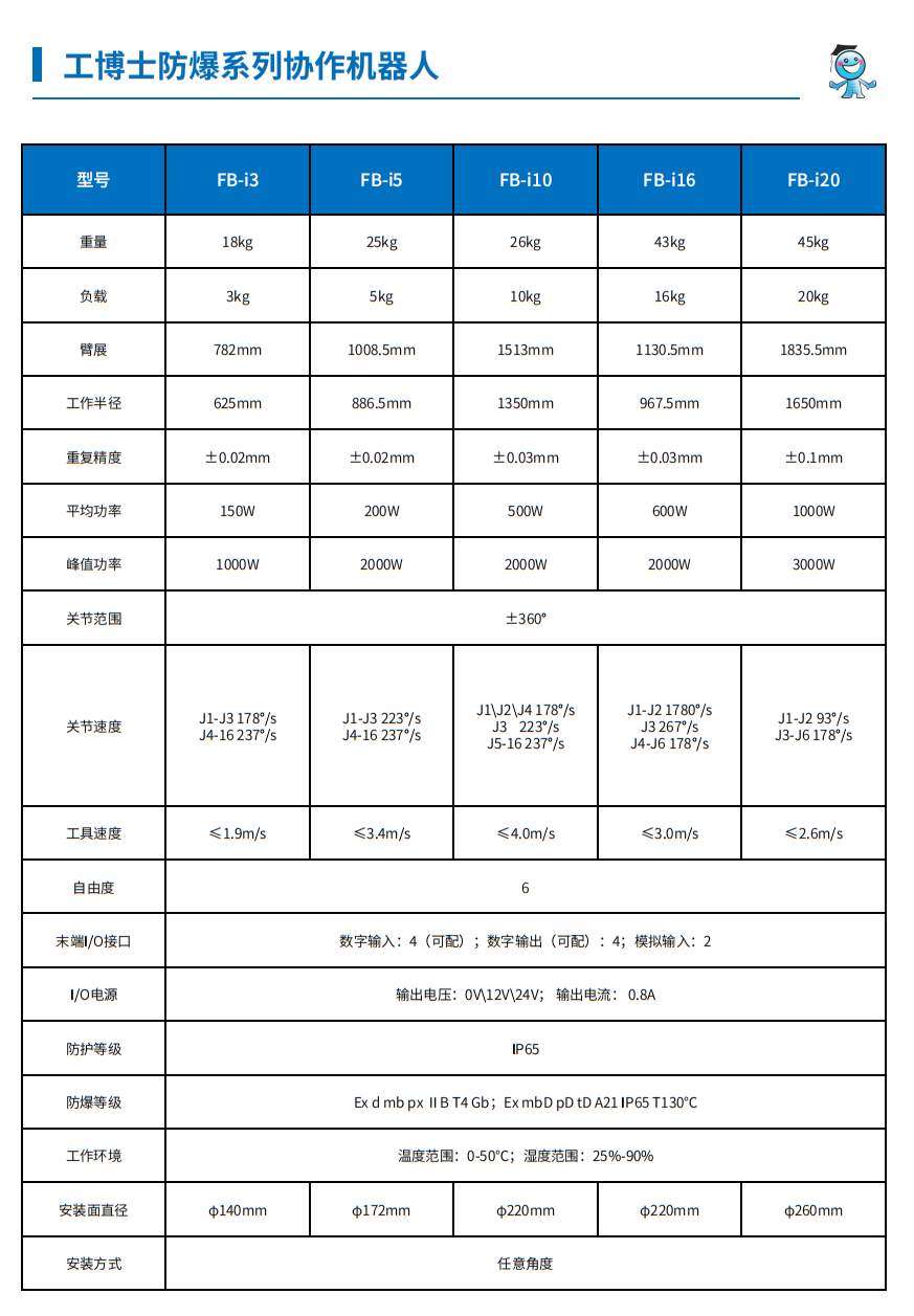 GFB防爆系列協作機器人具有3-16kg不同負載能力,是一款為滿足 更高防護標準的工作環境