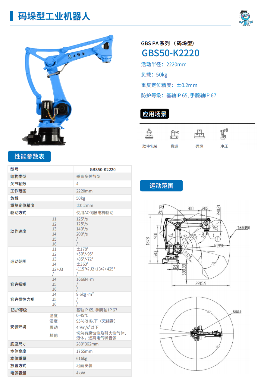 工博士機器人 GBS PA系列(碼垛型)GBS50-K2220 負載50kg 臂展2220mm |