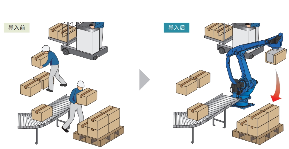 將對作業人員負擔較重的貨物搬運與堆疊作業自動化,可進行比人工更高速、更高精度的作業,減少了成本。
