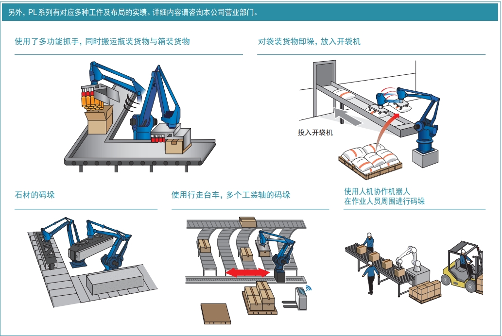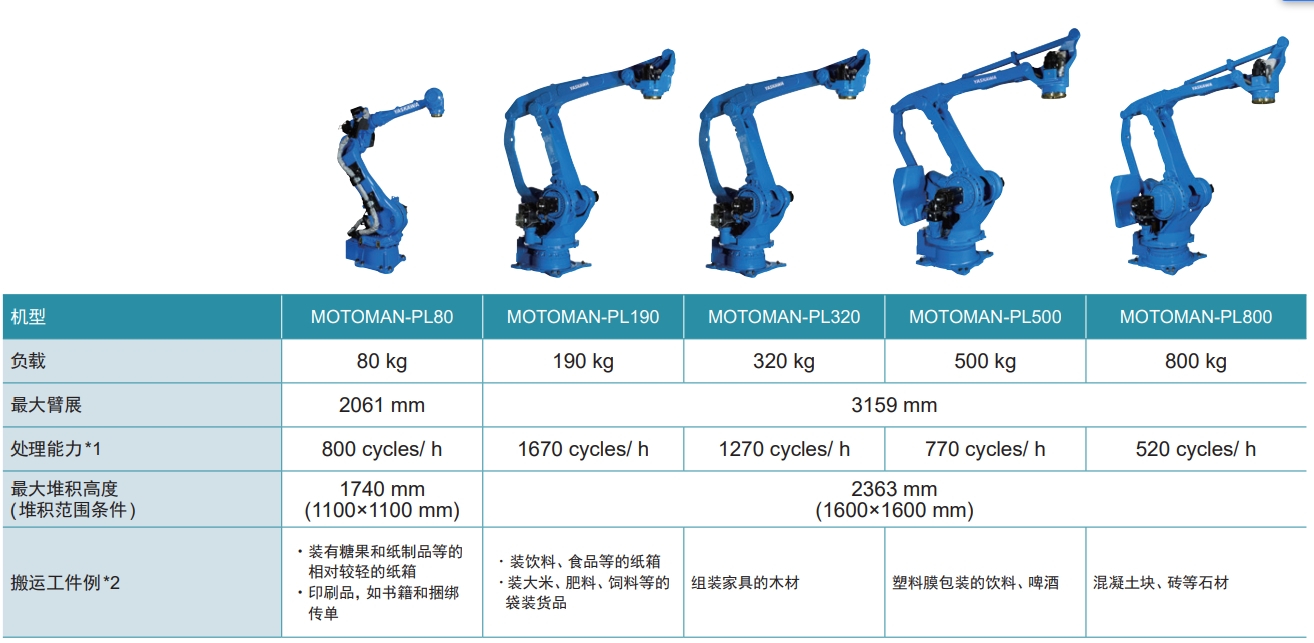 MOTOMAN-PL系列可對應多種形狀、大小的工件。特別是PL190,可對應箱裝、袋裝貨物的高速碼垛。