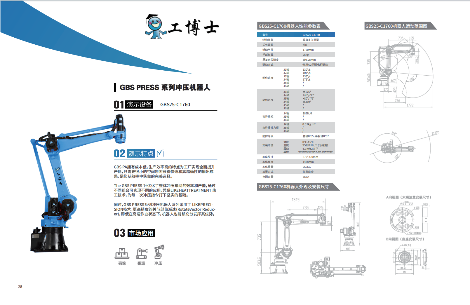 GBS PA擁有成本低,生產效率高的特點為工廠實現全面提升 產能,只需要很小的空間您將獲得快速和高***性的輸出成 果,是您從效率中獲益的***選擇。 The GBS PRESS 針優化了整體沖壓車間的效率和產能,通過 不同組合可實現不同的應用,憑借LIKEHEATTREATMENT 熱 工技術,為每一次沖壓指令打下堅實的基礎。 同時,GBS PRESS系列沖壓機器人系列采用了 LIKEPRECI