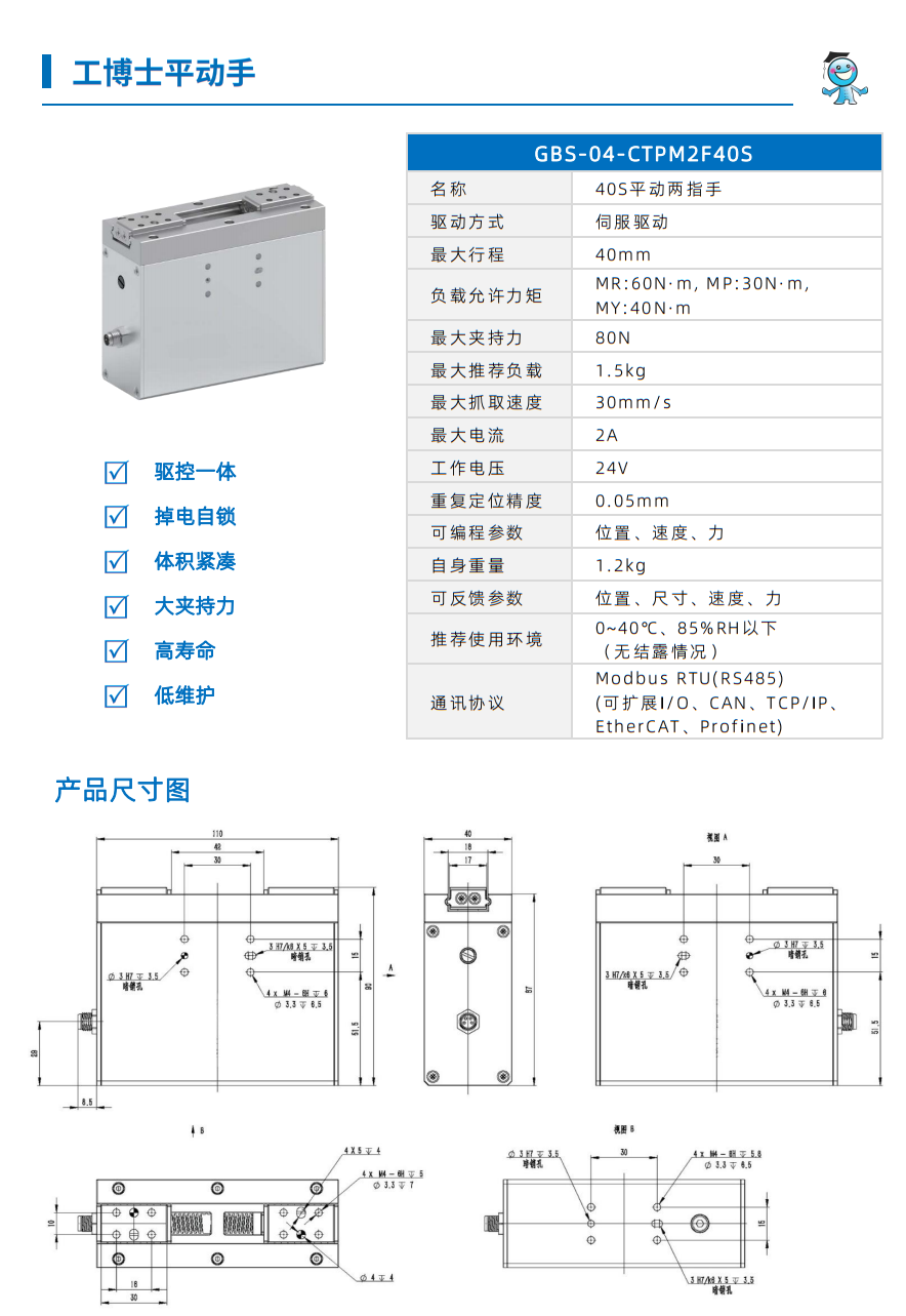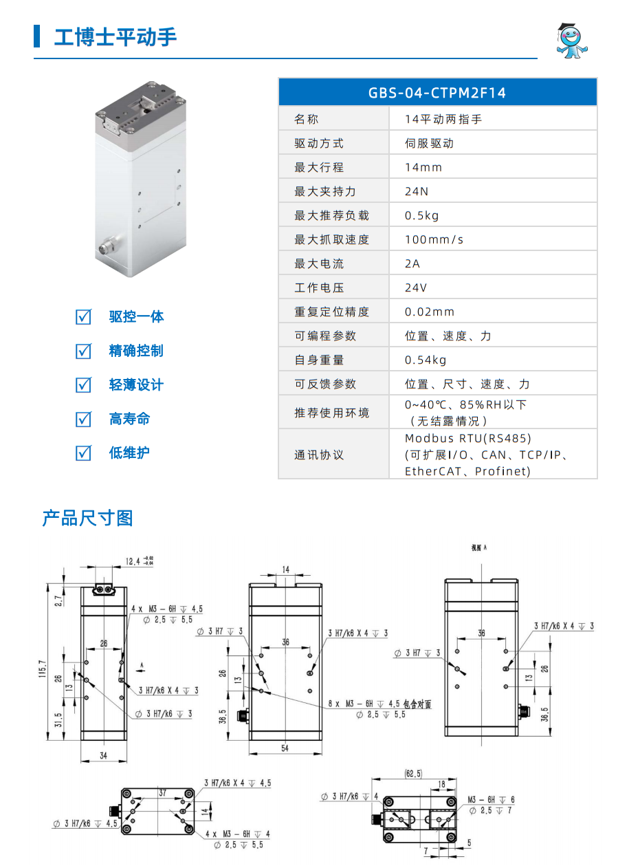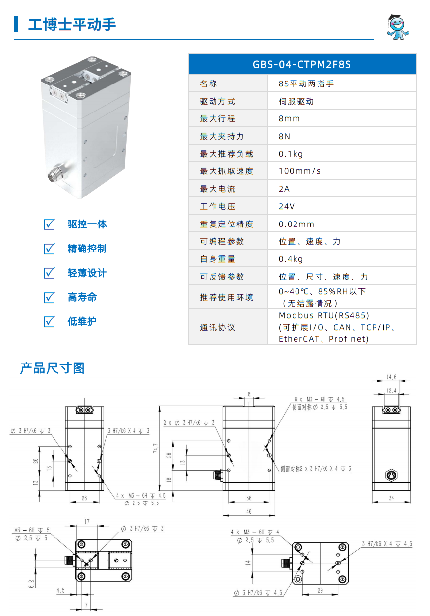 工博士自適應智能協作手GBS-04-CTPM2F26 平動兩指手 負載0.8KG 夾持力45N |