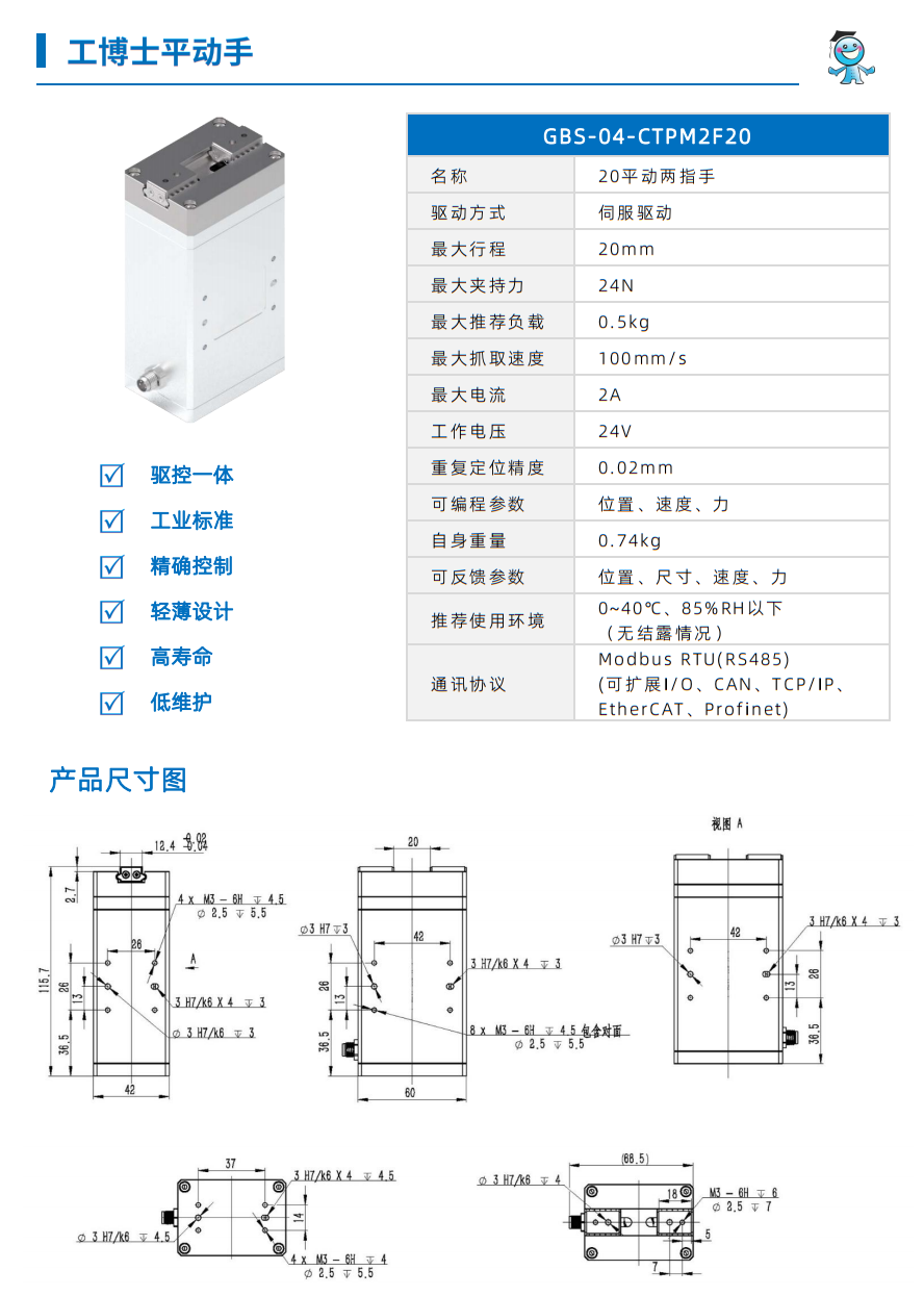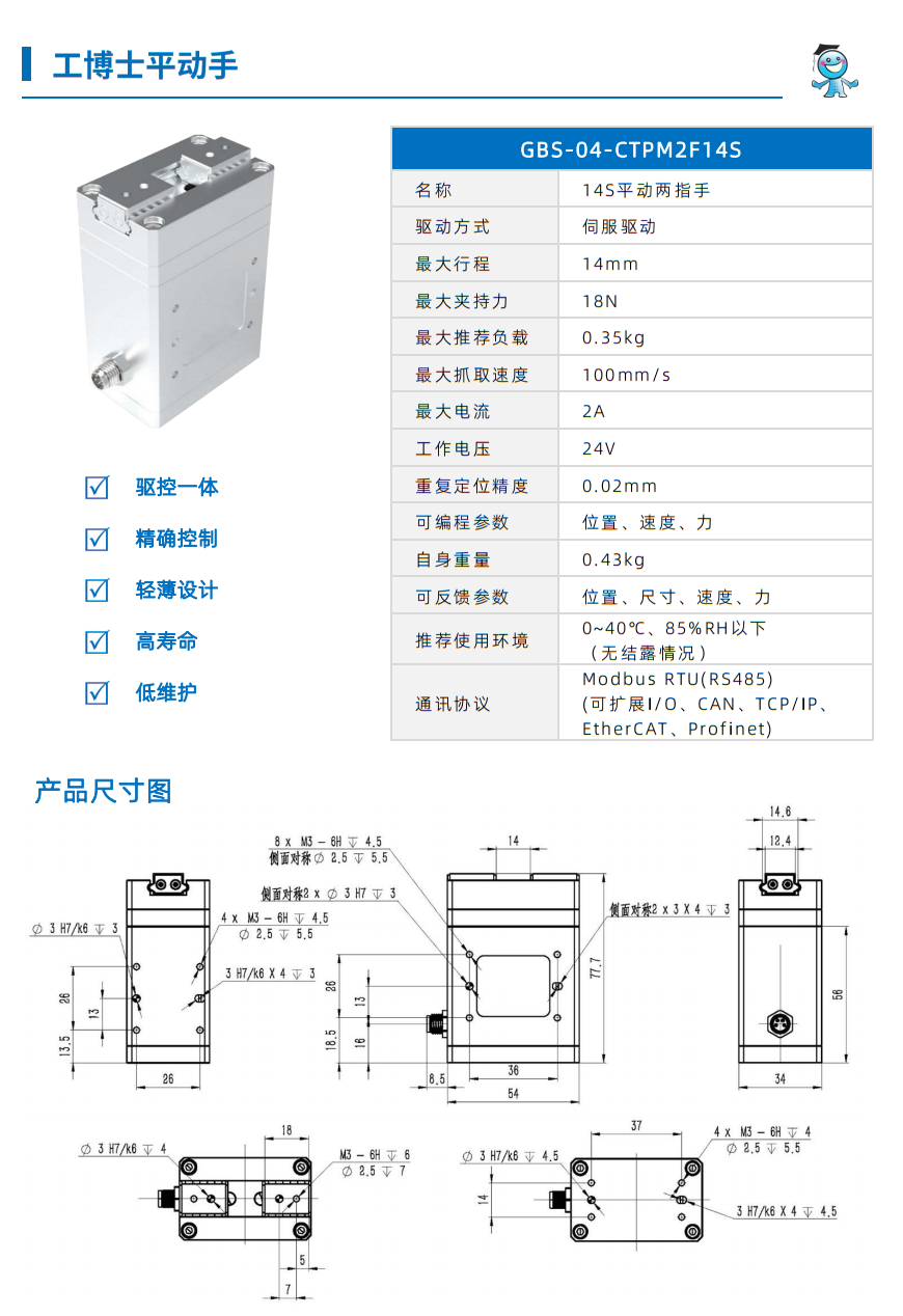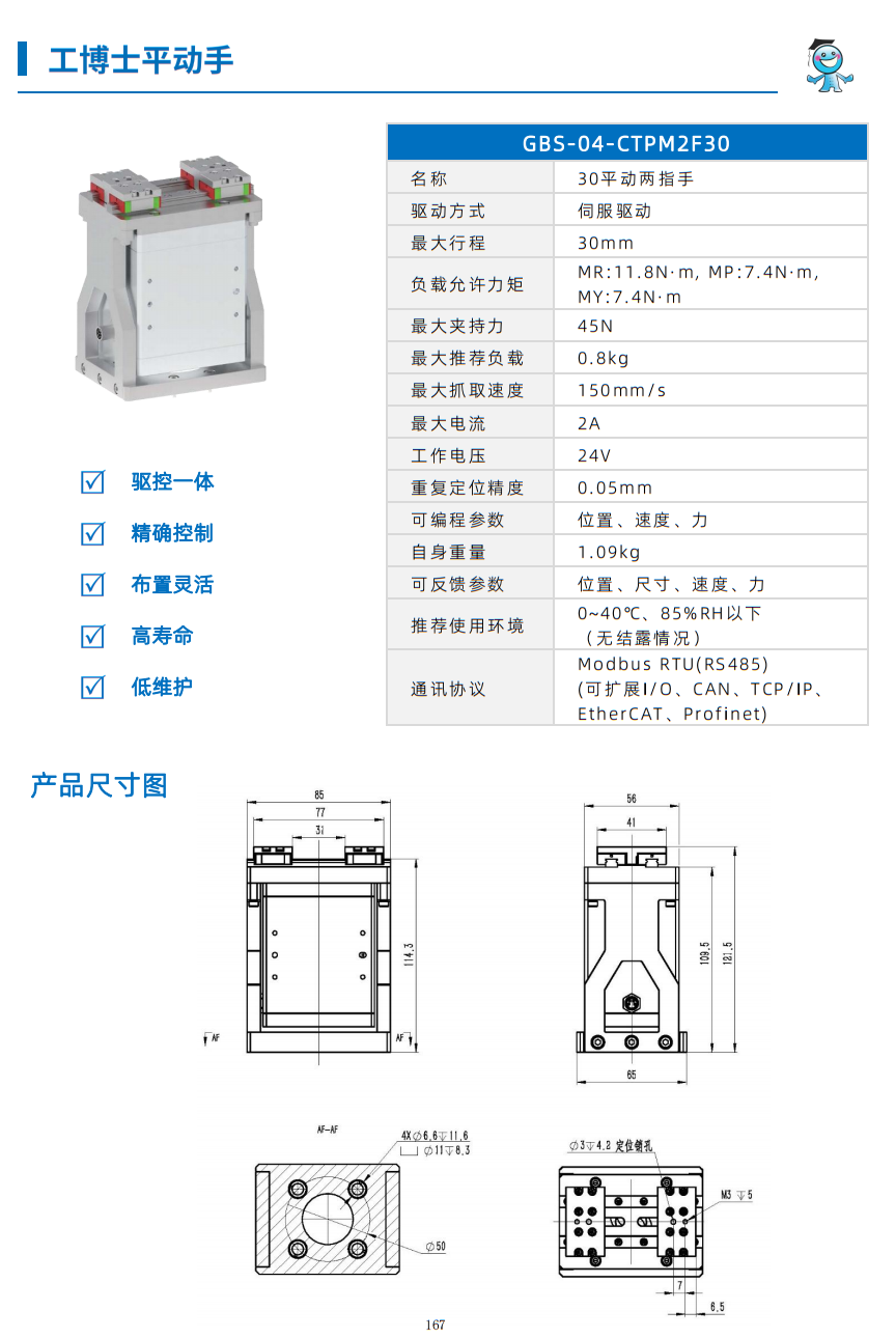 工博士自適應智能協作手GBS-04-CTPM2F26 平動兩指手 負載0.8KG 夾持力45N |