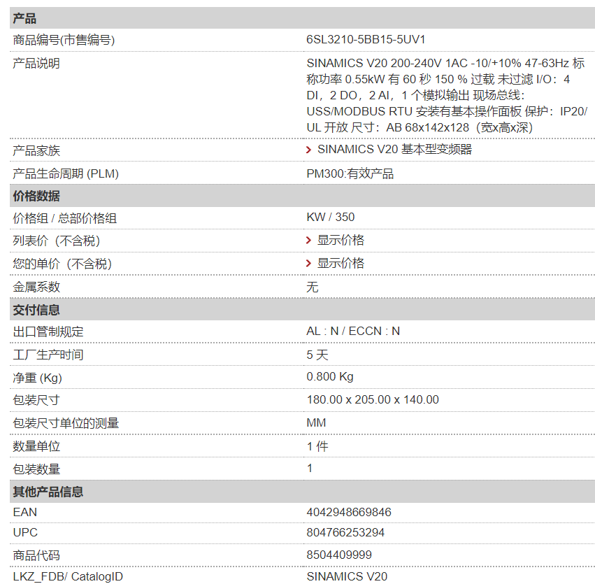 西門子V20變頻器 6SL3210-5BB15-5UV1 未過濾 0.55KW 200-240V