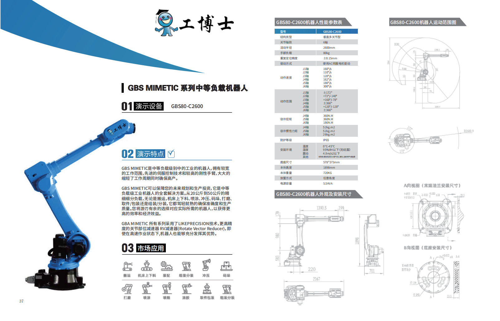 GBS MIMETIC是中等負載級別中的工業的機器人,擁有較寬 的工作范圍,**的伺服控制技術和較高的剛性手臂,大大的 縮短了工作周期同時確保高產。 GBS MIMETIC可以保障您的未來規劃和生產投資,它是中等負載級工業機器人的全套解決方案。從20公斤到50公斤的精 細細分負載,無論是搬運,機床上下料、噴涂、沖壓、碼垛、打磨、 取件/包裝還是組裝/分裝,它都駕輕就熟的確保準確度和生產 質量。您將游刃有余的選擇對應實際所需的機器人,以獲得更 高的效率和經濟效益。 GBA MIMETIC 所有系列采用了LIKEPRECISION技術,更高精 度的關節部位減速器 RV減速器(Rotate Vector Reducer),即 使在高速作業狀態下,機器人也能夠充分發揮其優勢。