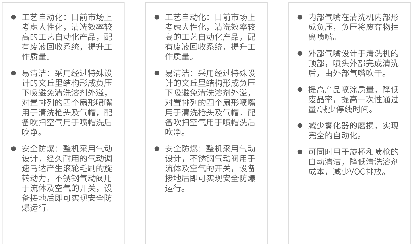 工藝自動化:目前市場上考慮人性化,清洗效率較高的工藝自動化產品,配有廢液回收系統,提升工作質量。
