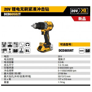得偉20V鋰電無(wú)刷緊湊沖擊鉆DCD805D2T |