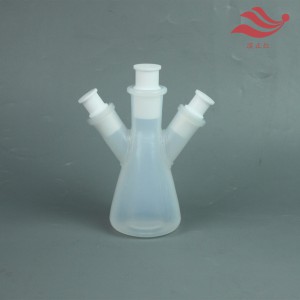 PFA三角燒瓶也稱錐形瓶(也有PP等其他材質,使用相對較少),由特氟龍PFA材質制成,縱剖面呈三角形狀的滴定反應器,一種化學實驗室常見的PFA器皿。一般使用于滴定實驗。為防止滴定液下滴時濺出,造成實驗誤差,將瓶子放磁攪拌器上。可用于普通實驗,制取氣體或作為反應容器。其錐形結構相對穩定,不易傾倒。比重大,并具有耐熱性,因此可沒入到水浴器或油浴器里進行加熱。另外采用平底,穩定性好。由于是三角燒瓶,不需要燒瓶架也是一個優點。