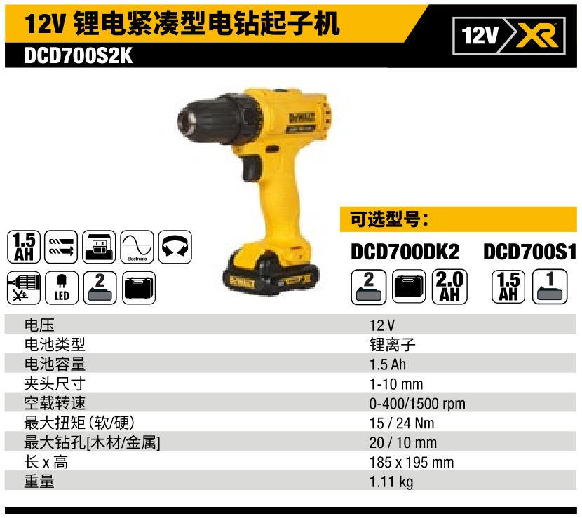 得偉(Dewalt)12V鋰電緊湊型電鉆起子機DCD700S2K