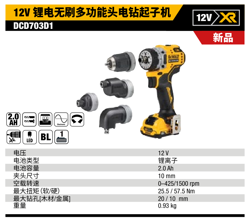 得偉(Dewalt)12V 鋰電無刷多功能頭電鉆起子機DCD703D1