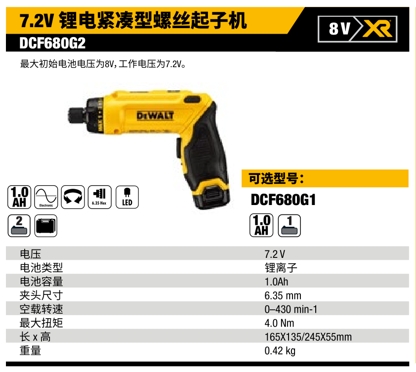 得偉(Dewalt)7.2V 鋰電緊湊型螺絲起子機DCF680G2