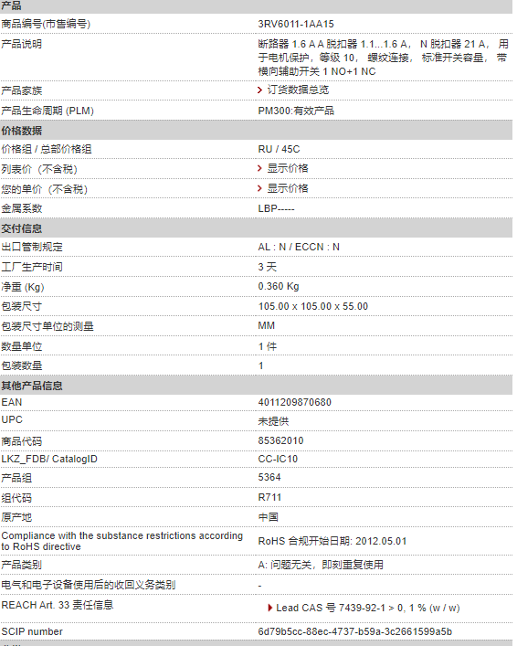 西門子斷路器 3RV6011-1AA15 1.6 A A 脫扣器 1.1...1.6 A, N 脫扣 |
