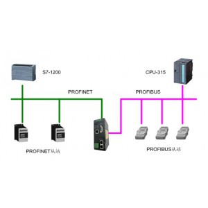 本網關實現Profibus-DP轉PROFINET功能,能夠實現Profibus-DP主站PLC的設備如儀表、變頻器、伺服、綜保、軟啟動器等設備接入到S7-1200、S7-1500、CPU315-2PN/DP、S7-400等PROFINET網絡系統。