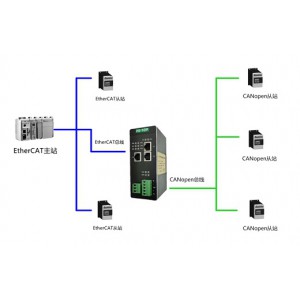 HT3S-ECS-COP網關連接到EtherCAT總線中作為從站使用,連接到CANOPEN總線中根據節點號進行讀寫。