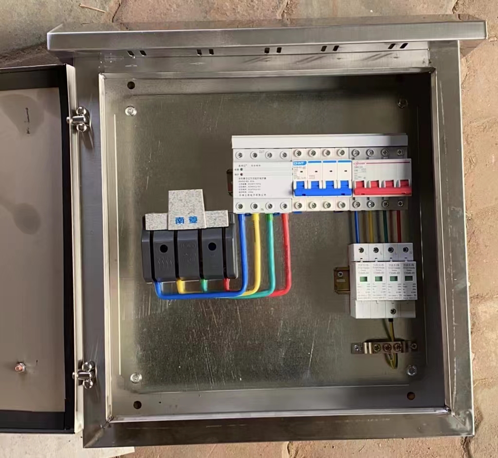 二、典型戶用單相配電箱設計 選擇箱體,與塑料箱體相比,金屬箱體較好。在金屬箱體中,不銹鋼的***好。金屬箱體中,性價比比較高的是鍍鋅板噴塑箱體,噴塑有二次防腐的功能。無論您的光伏配電箱是安裝在戶外還是安裝在室內,都需要注意箱體的防塵防水規格。戶外要用IP65等級,戶內要用IP21等級,如果是在海邊或者鹽霧環境比較惡劣的地區,在選擇光伏配電箱時,請務必選擇鍍鋅板噴塑、敷鋁鋅板噴塑、304不銹鋼或者更高規格的箱體,目的是防腐蝕。 常用戶用單相配電箱電氣設計 1、3kw單相配電箱 2、5kw單相配電箱 3、6kw單相配電箱 4、8kw單相配電箱 5、10kw單相配電箱 每個省對并網要求不同,有些地方對配電箱有些特殊要求,比如配電箱是否要安裝電表?電網接入方案中是否要求配電箱安裝防孤島裝置。我們在選擇購買光伏配電箱的時候,首先要和供電局確認要求。
