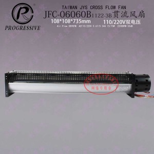 臺灣金億翔JYS貫流風機JFC-06060B1122-3B,與JFC-06060A1122-3B僅電機方向相反,兩款風機對稱使用,散熱長度達1470mm,2200轉高轉速大風量橫流風扇,雙滾珠軸承,扇葉直徑為60mm,AC230V,散熱長度為680mm,風機總長度(含電機)是735mm,機柜設備用貫流風機!