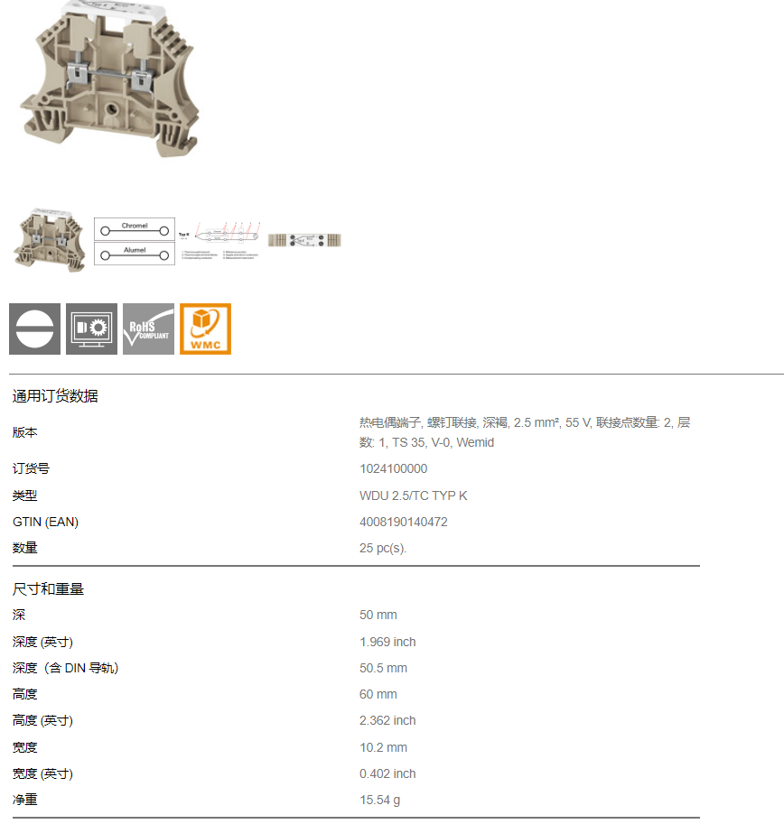 WDU 2.5/TC TYP K 魏德米勒 熱電偶接線端子 訂貨號1024100000 |